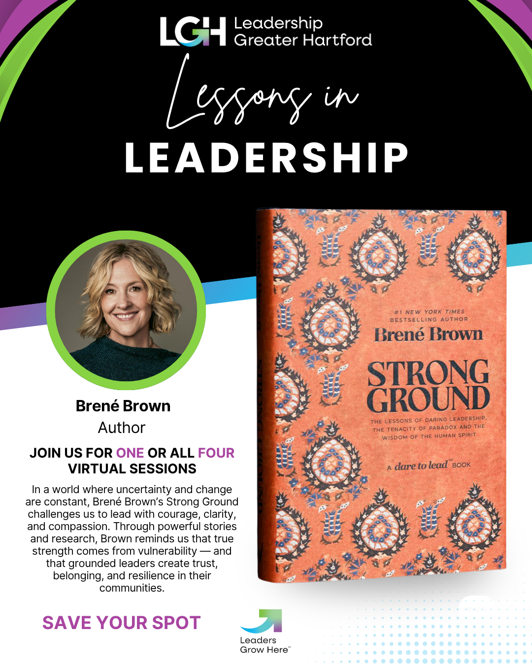 This virtual session launches Leadership Greater Hartford’s Lessons in Leadership 2026 series, centered on Strong Ground by Brené Brown. Participants will explore core themes of courage, belonging, and values-driven leadership, with a focus on grounding leadership practices during times of change.