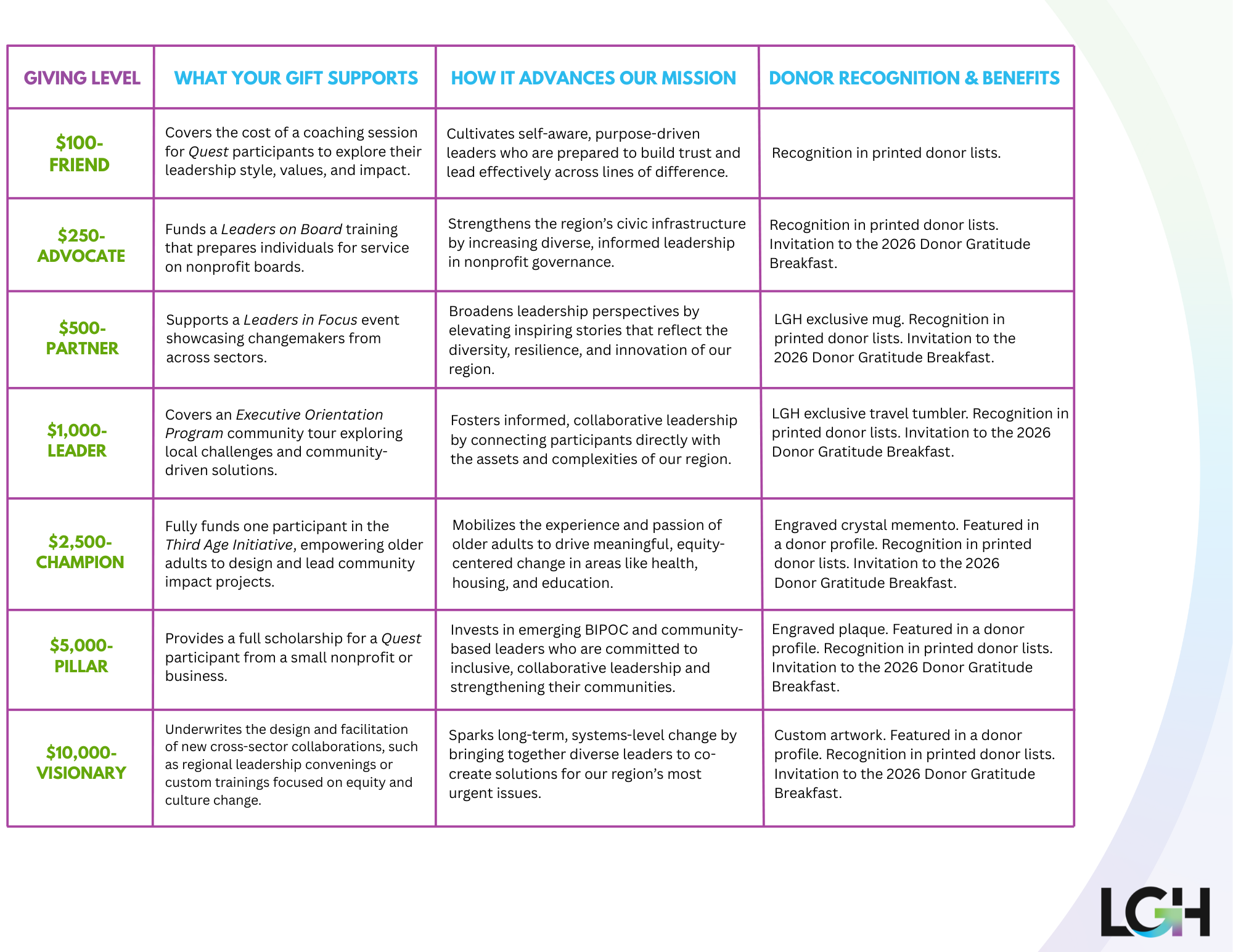 At Leadership Greater Hartford, we are deeply grateful for the generosity and commitment of our donors. This chart outlines our donor recognition levels—highlighting the ways we celebrate you throughout the year.
